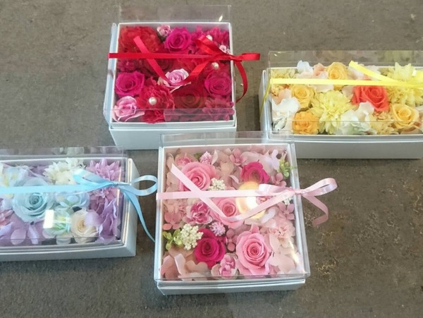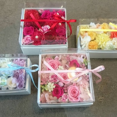 ・シースルーボックスのプリザーブドフラワーアレンジメント 正方形タイプ¥5,500/長方形タイプ¥4,400