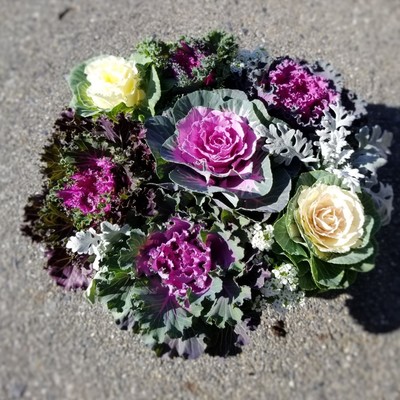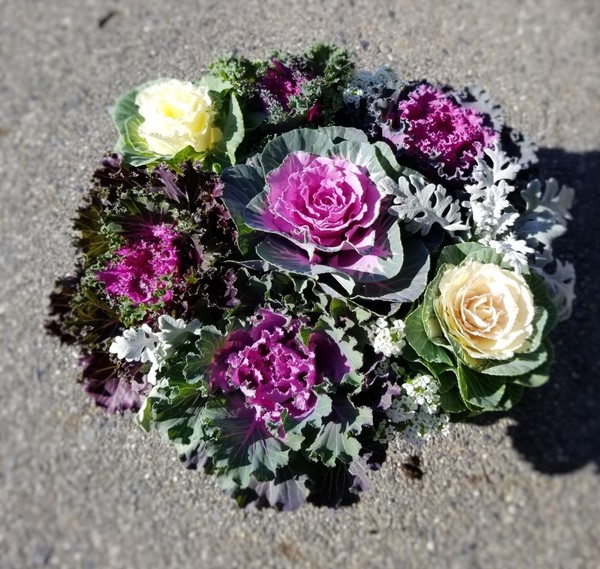 葉ボタンをメインにアリッサムやシロタエギクを寄せ植えにしました♪